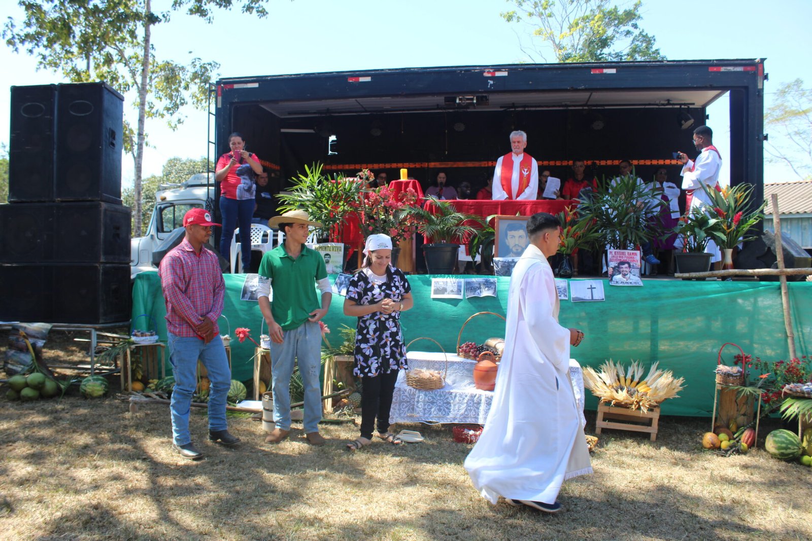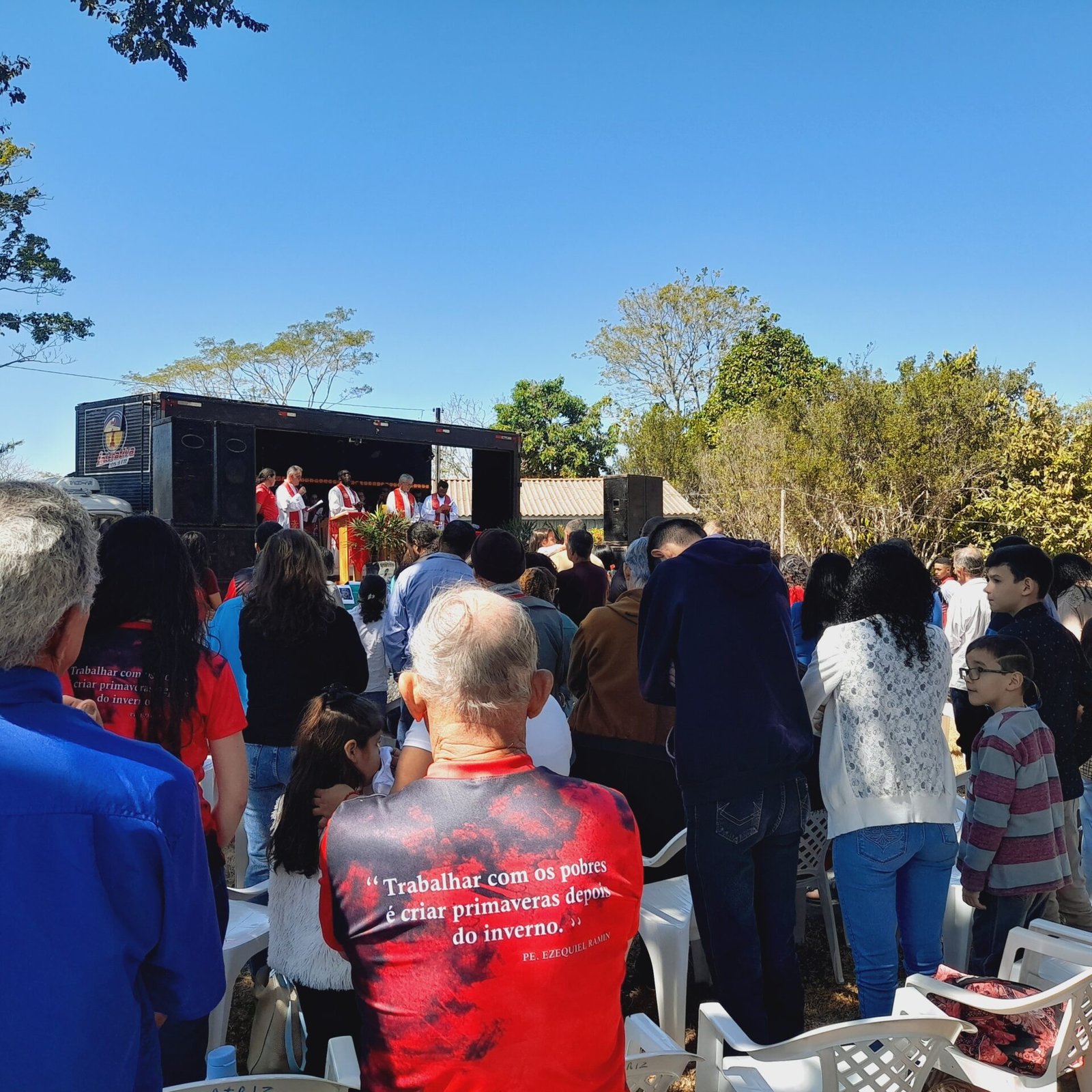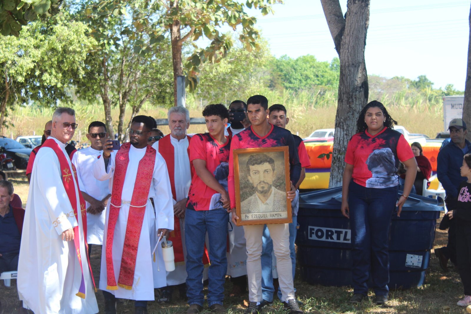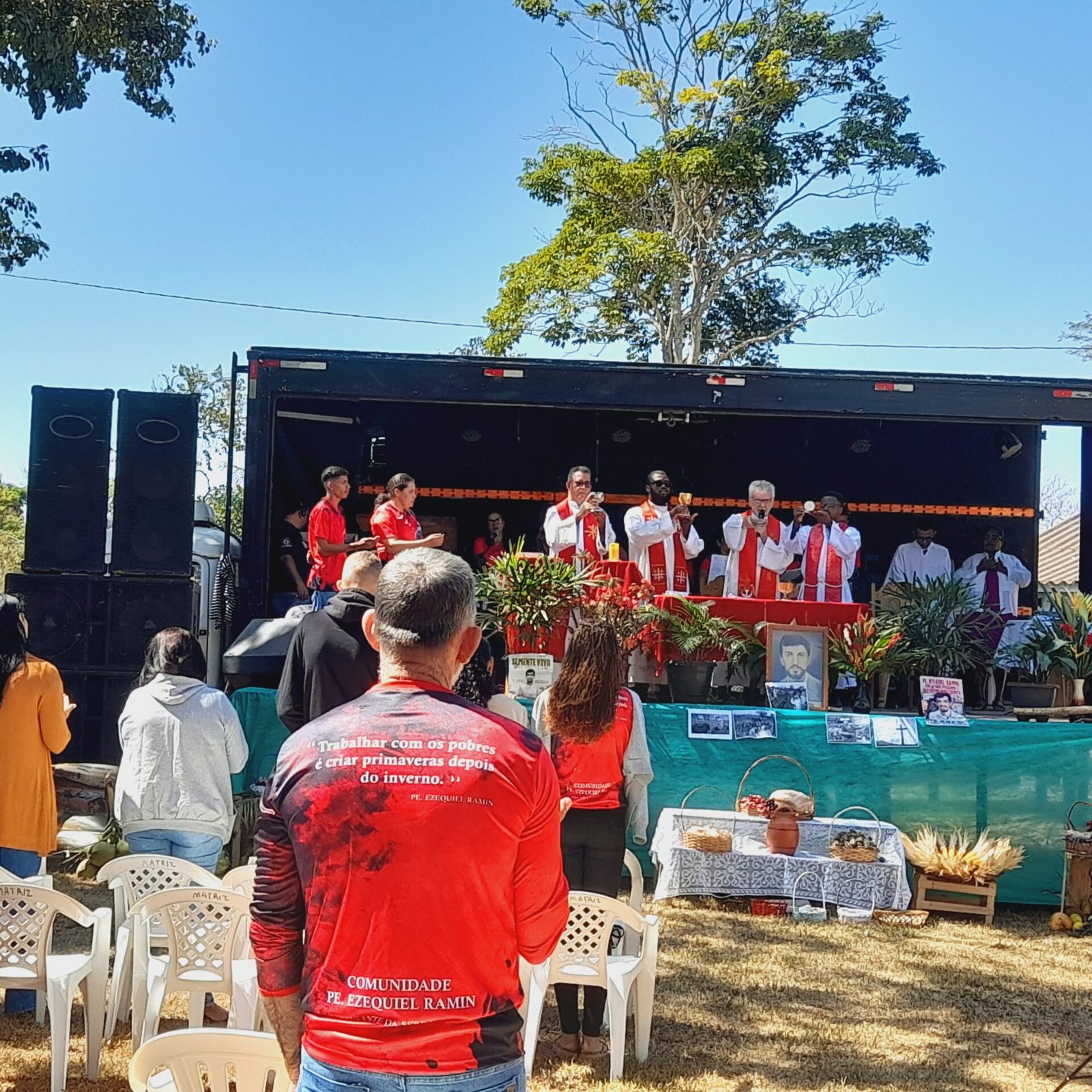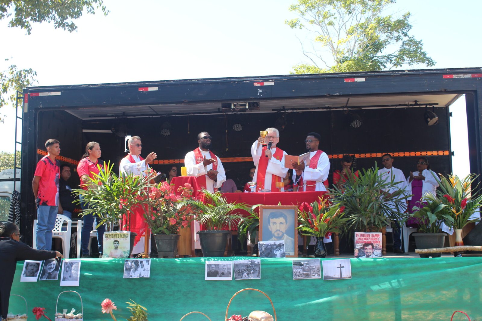 A celebração contou com a presença de padres combonianos. É importante destacar que Pe. Ezequiel Ramin iniciou sua vida religiosa em 1972 como missionário no Instituto dos Missionários Combonianos, da Ordem Religiosa de São Daniel Comboni. Após concluir seus estudos, foi ordenado padre em 1980. Para mais informações, leia a biografia completa no site: https://iper-amazonia.com.br/martires/pe-ezequiel-ramin/