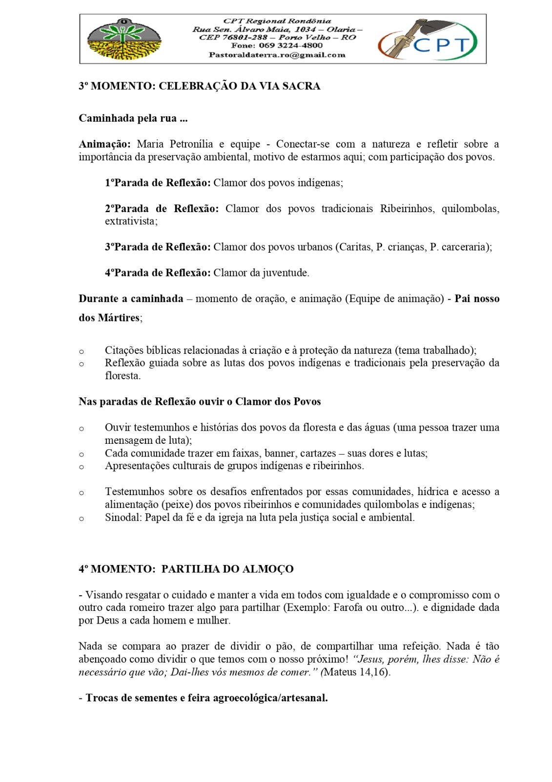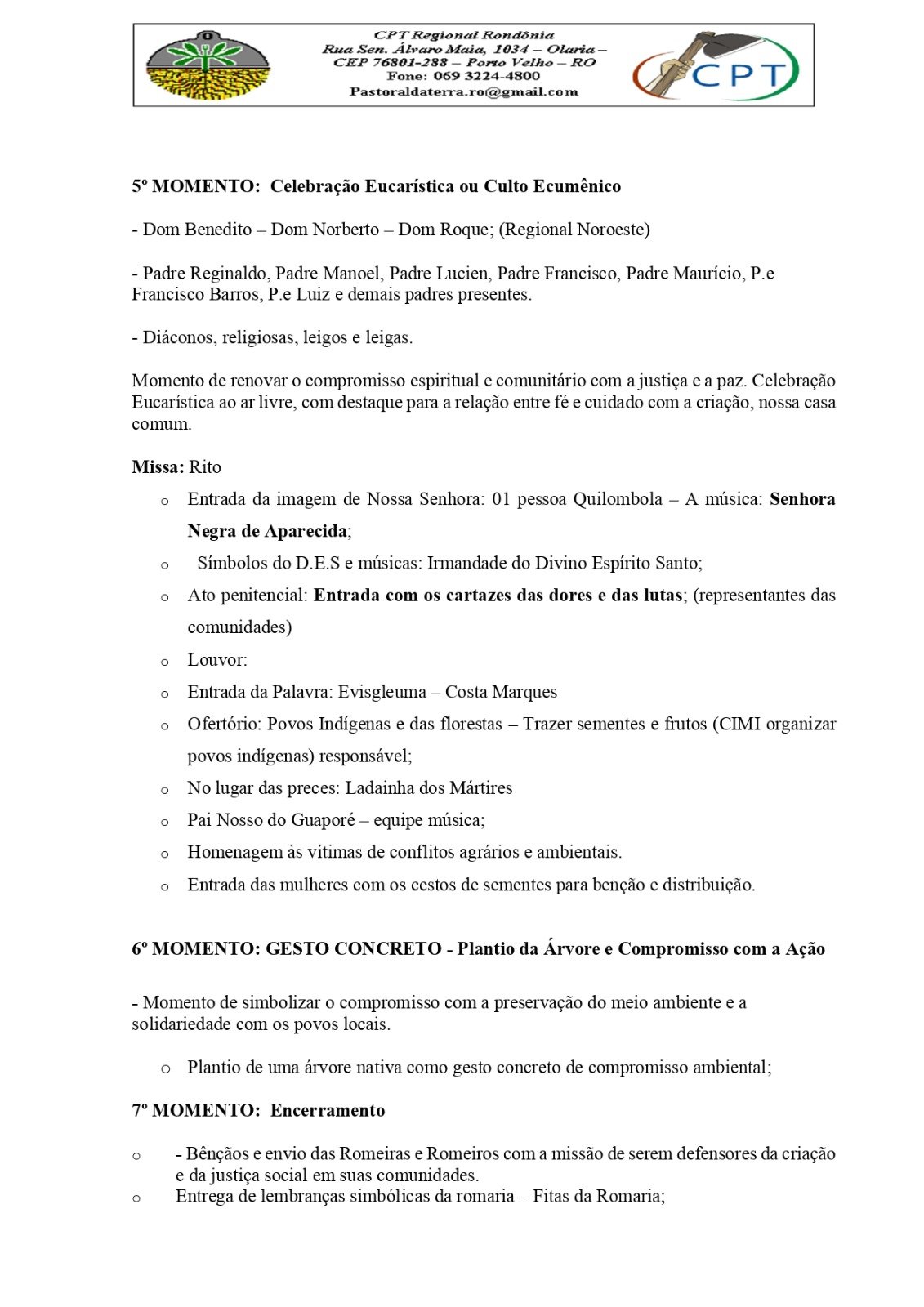 A Romaria começará oficialmente às 9h, com um momento celebrativo e uma caminhada saindo das margens do Rio Guaporé, em Costa Marques, até a Basílica Menor do Divino Espírito Santo, num percurso de aproximadamente 2 km. Durante a caminhada, paradas em locais simbólicos proporcionarão momentos de reflexão sobre a temática e o lema da Romaria, ressaltando o compromisso com a terra e os povos que nela habitam.