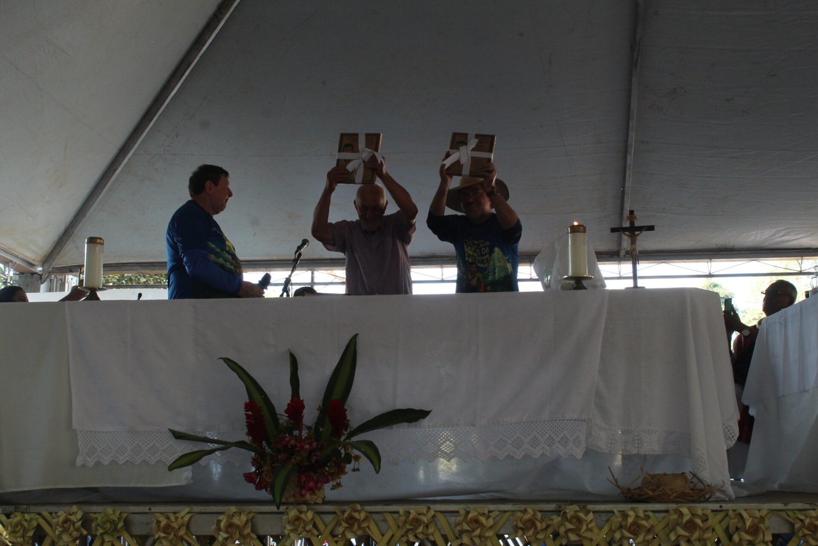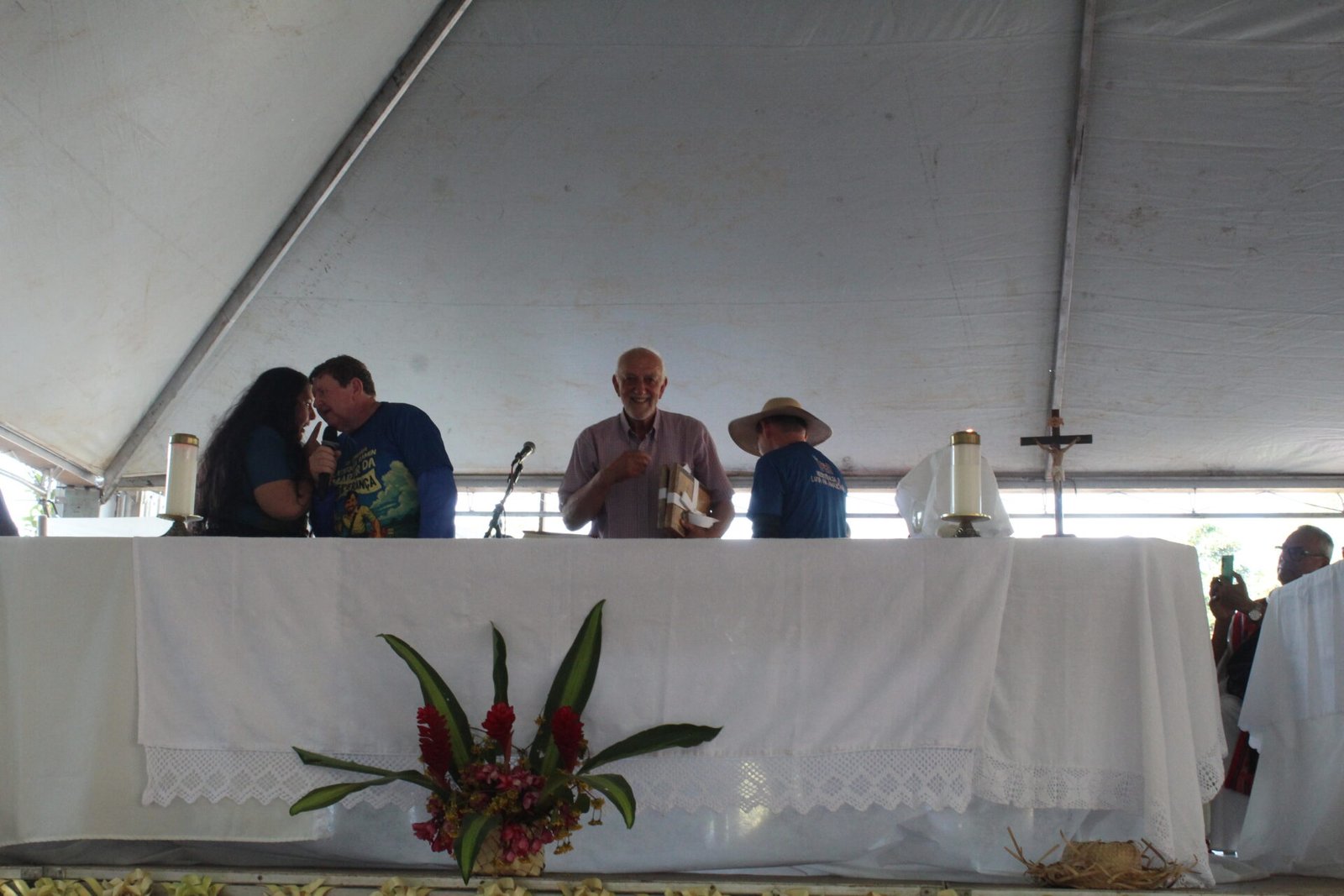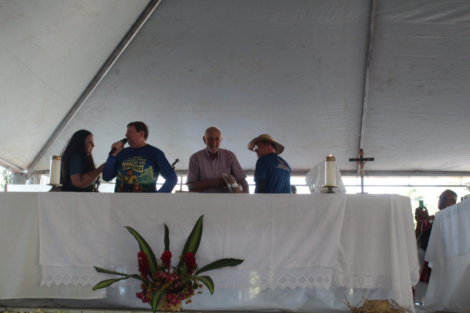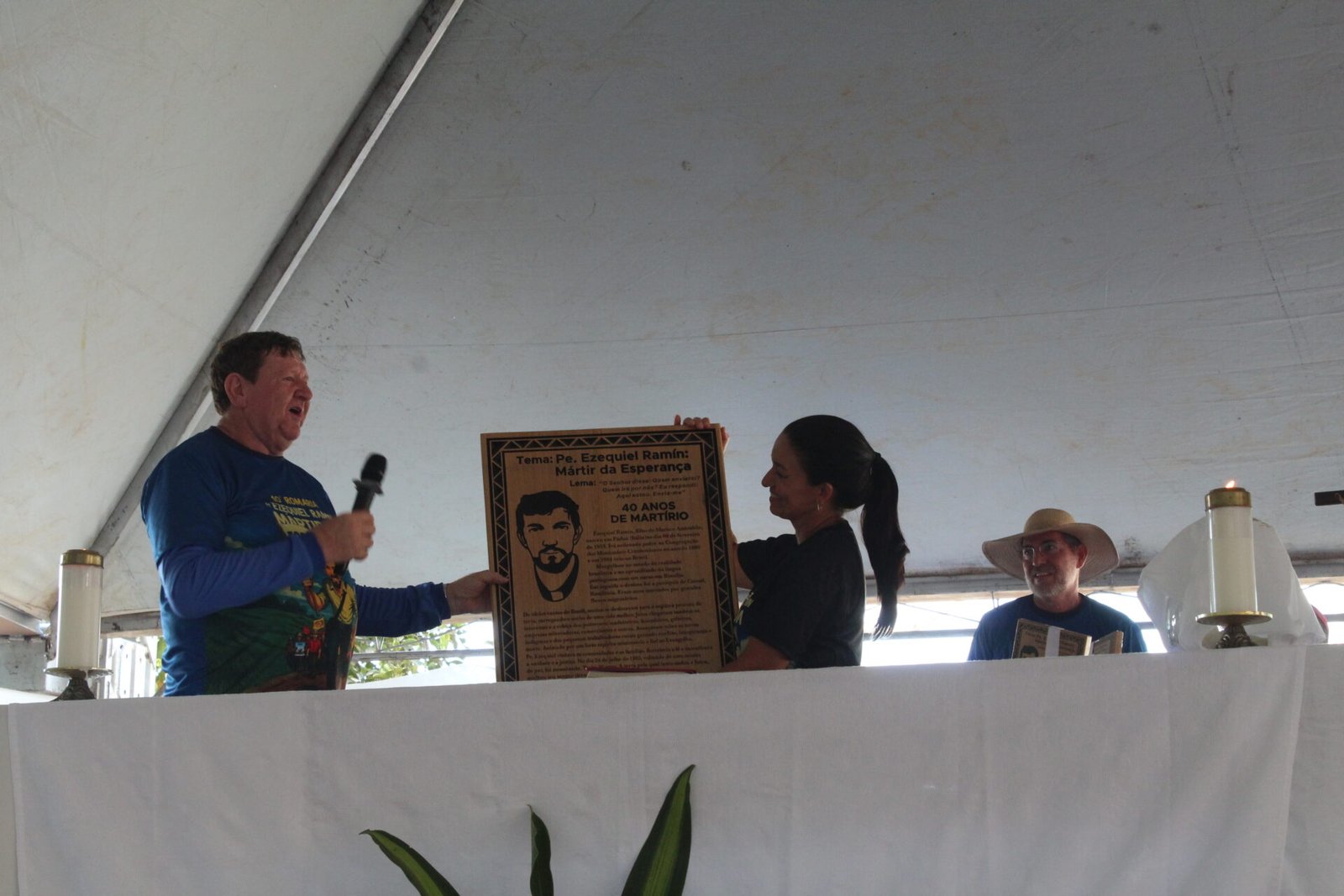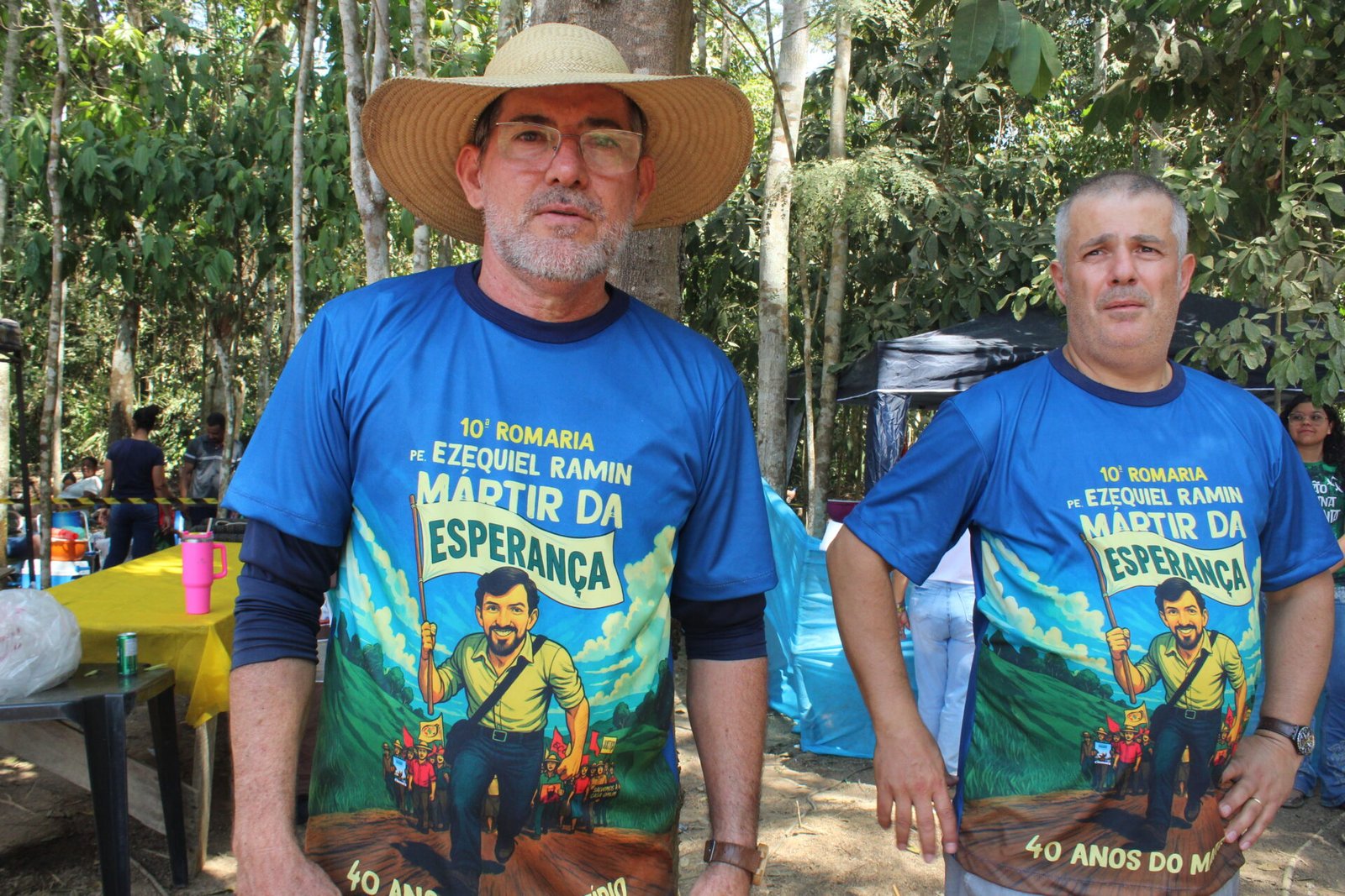 No encerramento da celebração da 10ª Romaria, um momento de forte emoção e reconhecimento marcou a homenagem a dois personagens fundamentais da história do martírio de Pe. Ezequiel Ramin: o sobrevivente Adílio de Souza e o companheiro de caminhada José Aparecido, falecido há cinco anos.