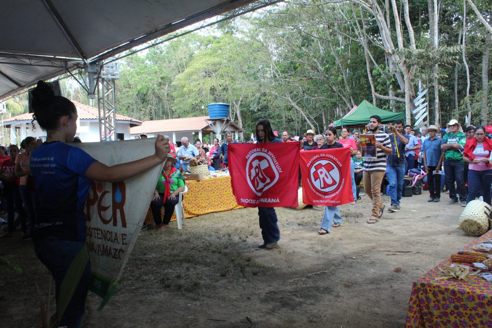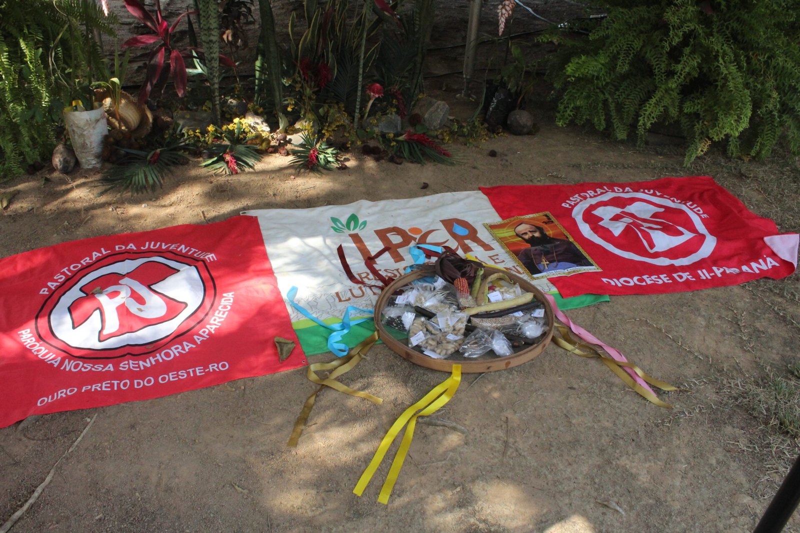 Durante a Santa Missa, no momento das oferendas, a Pastoral da Juventude conduziu um gesto simbólico carregado de sentido: os jovens entraram em procissão e, com reverência e firmeza, elevaram ao alto a bandeira do IPER, da PJ, os símbolos da Congregação Comboniana e as sementes — sinal de vida, resistência e esperança.