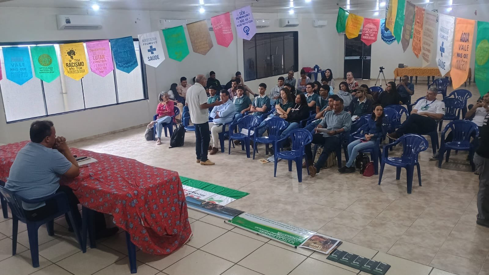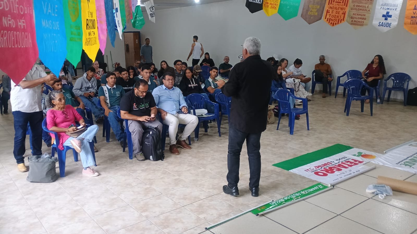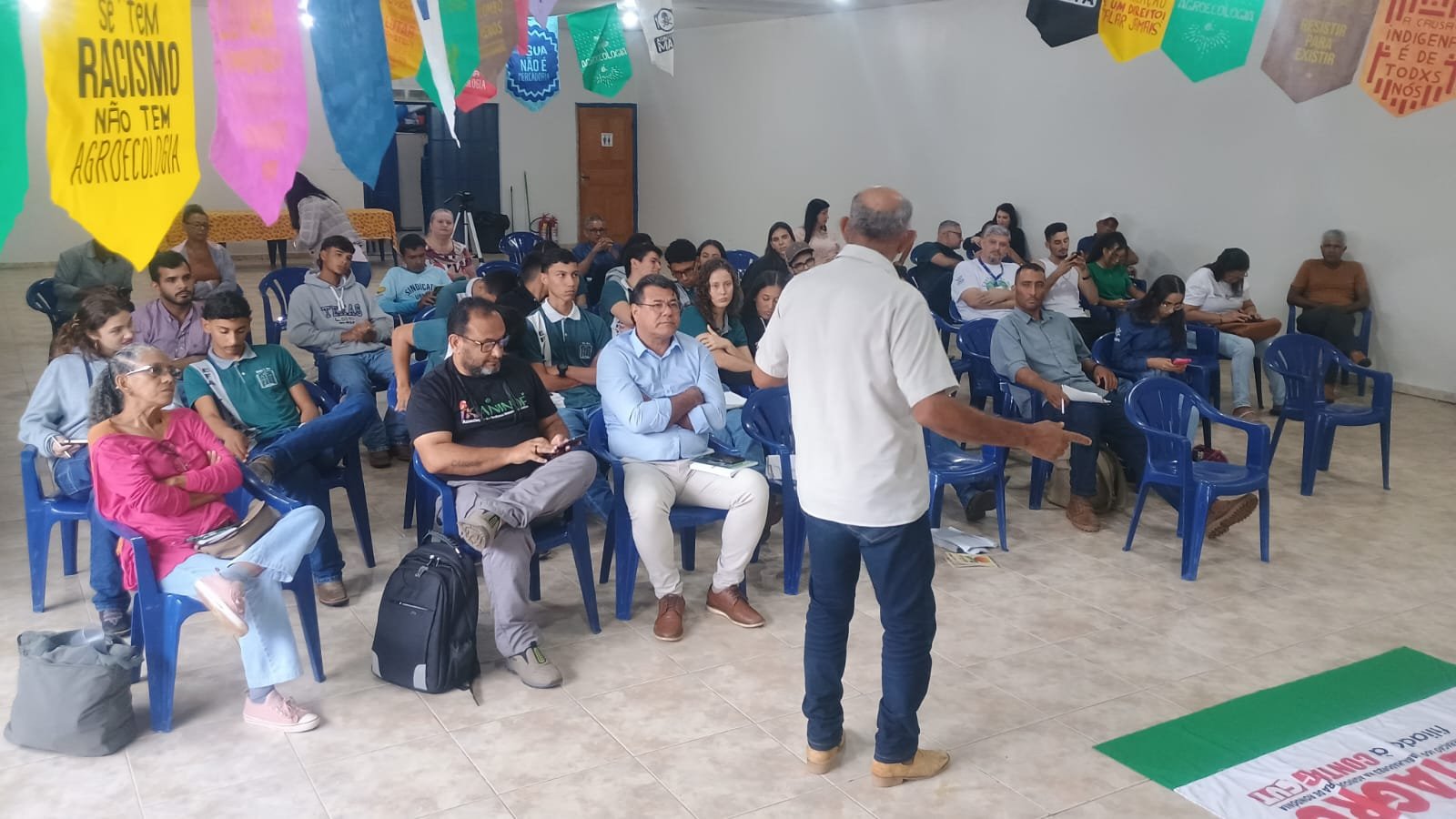 A palestra do professor Fernando Bilhava, da Unir Rolim de Moura, destacou críticas ao atual modelo de aprovação de agrotóxicos, apontando a falta de controle e fiscalização. Ele afirmou que a ciência por trás desses produtos vem de fora, submissa ao imperialismo global, e que os agrotóxicos, originados da indústria militar, não foram feitos para salvar vidas, mas para matar. Bilhava alertou para a guerra silenciosa no campo, disfarçada de progresso, e questionou as consequências do veneno que afeta tanto a terra quanto a vida humana, destacando que “vocês têm uma terra para a sua existência, mas não são vistos na vida real. As primeiras vítimas são os explorados e os oprimidos”.