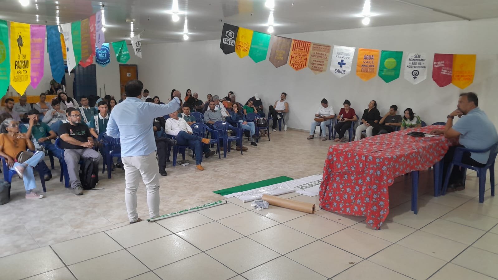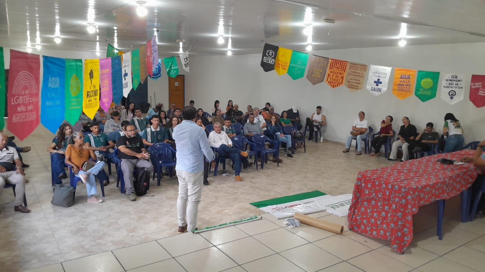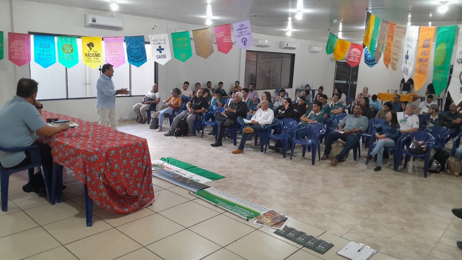 A palestra do professor Fernando Bilhava, da Unir Rolim de Moura, destacou críticas ao atual modelo de aprovação de agrotóxicos, apontando a falta de controle e fiscalização. Ele afirmou que a ciência por trás desses produtos vem de fora, submissa ao imperialismo global, e que os agrotóxicos, originados da indústria militar, não foram feitos para salvar vidas, mas para matar. Bilhava alertou para a guerra silenciosa no campo, disfarçada de progresso, e questionou as consequências do veneno que afeta tanto a terra quanto a vida humana, destacando que “vocês têm uma terra para a sua existência, mas não são vistos na vida real. As primeiras vítimas são os explorados e os oprimidos”.